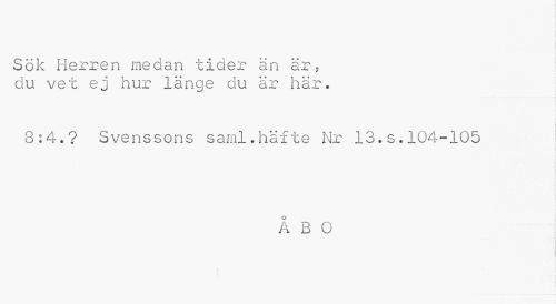 //// Sök Herren medan tider än är, du vet ej hur länge du är här, //// 8:4.? Svenssons sarnl.häfte Nr 13.s.104-105 //// ÅBO //// 4 ////