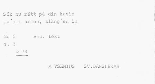 //// Sök nu rätt på din kusin Ta 'n i armen, släng'en in //// Nr 6 End. text //// s. 6 //// D '74 //// A YS ENIUS S V.DANSLEKAR ////