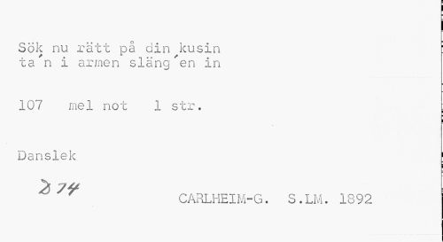 //// Sök nu rätt på din kusin : //// ta'n i armen släng'en in //// 107 mel not 1 str. . //// ! //// Danslek //// CARLHEIM-G. S. LM. 1892 ////