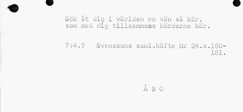 //// Sök åt dig i världen en vän så kär, som med dig tillsammans bördorna bär. //// 7:4.? Svenssons saml.häfte Nr 24.s.180- //// 181. //// ÅBO ////