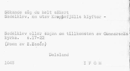 //// Sökande såg du helt säkert //// Sadelklev, en utav Kropjhefjälls klyftor - //// ¦ //// Sadelklev eller sagan orn tillkomsten av Gunnarsnäs ! kyrka. s.17-22 //// (Poem av E.Essen) i //// Dalsland //// 1048 I F G H ////