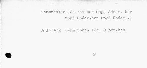 //// • . . , - . //// Sömmerskan Ida,som bor uppå Söder, bor //// uppå Söder,bor uppå Söder... //// A 16:452 Sömmerskan Ida. 8 str.kom. ////