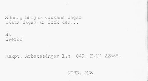 //// Söndag börjar veckans dagar bästa dagen är dock den... //// Sk //// hveroa //// Mskpt. Arbets sånger I, s. 849. E.U.' 22365. //// NORD. MUS //// i ////