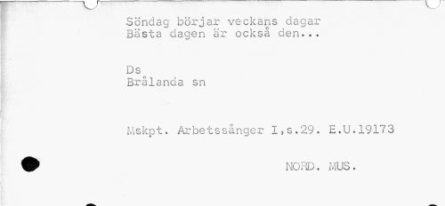 //// Söndag börjar veckans dagar Bästa dagen är också den... //// Dso //// Brålanda sn //// Mskpt. Arbetssånger Ifs.29. E.U.19173 • NORD. MUS. ////