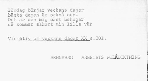 //// Söndag börjar veckans dagar //// bästa dagen är också den. ]. //// Det är den mig bäst behagar då kommer säkert min lilla vän //// Vism&tiv om veckans dagar XX s.301. //// ¦REHNBERG ARBETETS FOLKDIKTNING ////