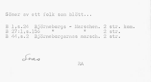 //// Söner av ett folk som blött... //// B l?s.24 Björneborgs - Marschen. 2 str. kom. B 27 :15 s. 156 55 11 2 str. //// B 44,s.2 Björneborgarnas marsch. 2 str. //// RA ////