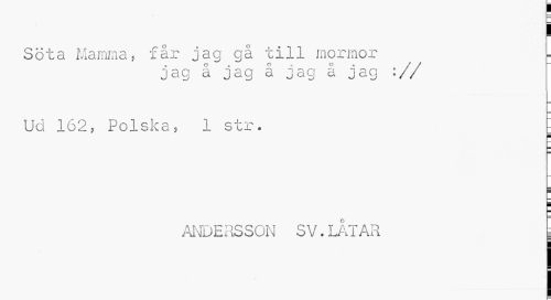 //// Söta Mamma, får jag gå till mormor //// jag å jag å jag å jag :// //// Uö 162, Polska, 1 str. j //// i //// ANDERSSON SV.LÅTAR | ////