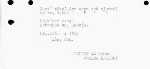 //// Söta.' söta.' Kom oxen och tjuren T SÖ ta, Söta{t " » //// Folklore V:348 ^ Njurunda sn, Medelp. //// Mel.not. 1 str. //// Lång kom. //// DYBECK MS KVHAA //// MOBERG EXCERPT ////
