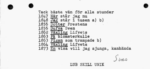 //// Tack bästa vän för alla stunder //// 1Ö47 Här står jag nu //// iSifÖ Jag står i tusen a) b) //// 1056 Dotter Prestens //// 1056 Dufva Sven //// 1Ö62 Växling Lifvets //// 1Ö63 Pigan som trampade b) //// 1Ö64 Växling Lifvets //// 1Ö73 En visa vill jag sjunga, kanhända //// Suoa //// LUB SKILL UNIK ////