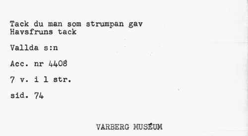 //// Tack du man som strumpan gav Havsfruns tack //// Valida s:n //// r //// ? //// Åcc. nr 4403 //// 7 v. i 1 str. sid. 74 //// VÅRBERG MUSÉUM ////