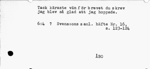 //// Tack käraste vän för b revet du skrev jag blev så glad att jag hoppade. //// 6:4 ? Svenssons s arril. häfte Nr. 16, //// s. 123-124 //// ® ÅBO //// A ////