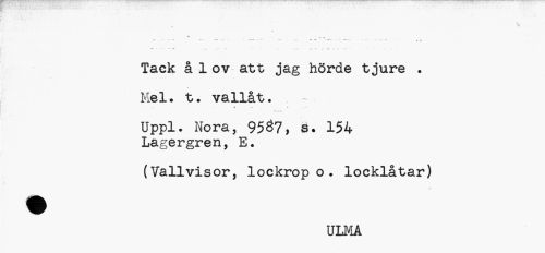 //// Tack å 1 ov att jag hörde tjure . Mel. t. vallåt. //// * c j /. //// Uppl. Nora, 9537, s. 154 //// Lagergren, E. //// (Vallvisor, lockrop o. locklåtar) //// ULMA ////
