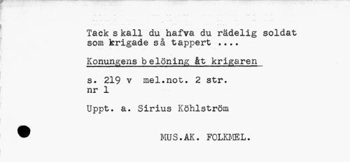 //// - - ...\ - ••• • • < i X //// Tack s kall du hafva du rädelig soldat som krigade sa väppBrw • • • • //// Konungens belöning åt krigaren //// s. 219 v mel.not. 2 str. nr 1 //// Uppt. a. Sirius Köhlström ® MUS.AK. FOLKMEL. ////