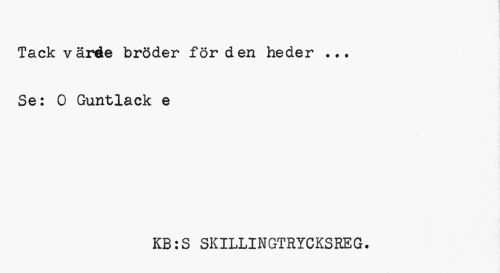 //// Tack värée bröder för den heder ... Se: O Guntlack e //// KB:S SKILLINGTRYCKSREG. ////
