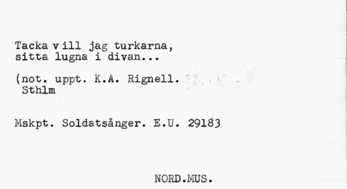 //// I //// Tacka v ill jag turkarna, sitta lugna i divan... //// (not. uppt. K.Å. Rignell. " ~ //// Sthlm //// } //// Mskpt. Soldatsånger. E.U. 291Ö3 //// i //// NORD.MUS. ////