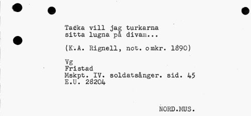 //// Tacka vill jag turkarna sitta lugna på divam... //// (K.A. Rignell, not. omkr. 1890) //// Vg //// Fristad //// Mskpt. IV. soldatsånger, sid. 45 //// E.U. 28204 //// NORD.MUS. ////