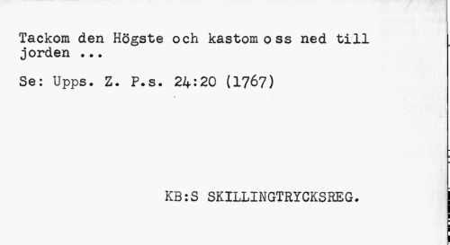 //// Tackom den Högste och kastom oss ned till jorden //// Se: Upps. Z. P.s. 24:20 (1767) //// KB:S SKILLINGTRYCKSREG. ////