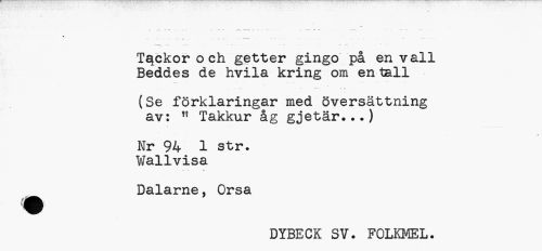 //// \ " ¦ ... //// Tackor och getter gingo på en vall //// Beddes de hvila kring om en tall //// . • • ... ... f .«, //// (Se förklaringar med översättning av: t! Takkur åg gjetär.. •) //// Kr 94 1 str. Wallvisa //// Dalarne, Orsa //// DYBECK SV. FOLKMEL. ////