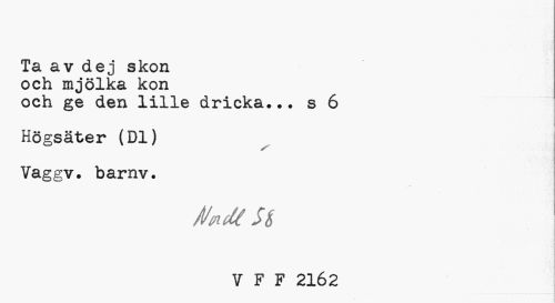 //// Ta av dej skon och mjölka kon //// och ge den lille dricka... s 6 Högsäter (Dl) Vaggv. barnv. //// #*dt SS //// V F F 2162 ////