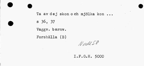 //// t //// Ta av dej skon o eh mjölka kon ... //// ^ s 36, 37 //// Vaggv. barn v. Forshälla (B) //// I.F.G.H. 5000 ////