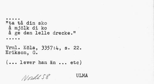 //// « # • # • //// nta tå din sko å mjölk di ko å ge den lelle drecke." //// Vrml. Köla, 3357:4, s. 22. //// Erikson, G. //// (... lever han än ... etc) //// sttoJrff ULMA ////