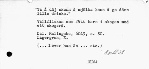 //// t!Ta å däj skonn å mjölka konn å ge därm lille dricka." //// Vallflickan som fått barn i skogen med ett skogsrå. //// Dal. Malingsbo, 6049, s. 30. //// Lagergren, E. //// (... 1 ever han än ... etc.) //// ULMA ////