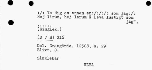 //// :/: Ta dig en annan en:/:/:/: som jag:/: Hej lirum, hej larum å leva lustigt som £ jag", //// (Ringlek.) //// (D 7 B) 216 //// Dal. Grangärde, 12508, s. 29 //// Blixt, 0. Sånglekar //// ULMA ////