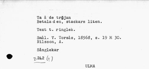 //// v //// Ta å de trgjan //// Betala den, stackars liten. //// f //// Text t. ringlek. //// Smål. V. Torsås, 10563, s. 19 M 30. //// Nilsson, A. Sånglekar • ^242 6 j //// ULMA ////