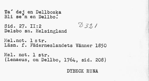//// Ta' deg en Dellboska Bli se n en Dellbcu //// Sid. 27. 11:2 3% / //// Delsbo sn. Helsingland Mel.not. lstr. //// Läsn. f. Fäderneslandets Vänner 1Ö50 Mel. not. 1 str. //// (Lenaeus, om Dellbo, 1764, sid. 20Ö) //// DYBECK RUNA ////