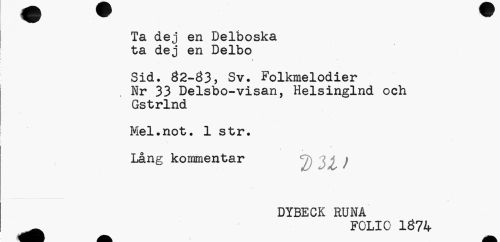 //// Ta dej en Delboska ta dej en Delbo //// Sid. 82-83, Sv. Folkmelodier , Nr 33 Delsbo-visan, Helsinglnd och Gstrlnd //// Mel.not. 1 str. Lång kommentar //// DYBECK RUNA //// A FOLIO 1874 ////