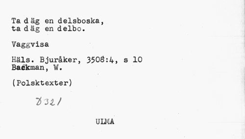 //// Ta dag en delsboska, ta d äg en delbo. //// Vaggvisa //// Häls. Bjuråker, 3500:4, s 10 Baékman, W. //// (Polsktexter) //// UIMÅ ////