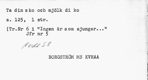 //// Ta din sko och mjölk di ko s. 125, 1 str. //// (Tr.Nr 6 i "Ingen är som sjunger..." //// Jfr nr 5 //// BORGSTRÖM MS KVHAA ////