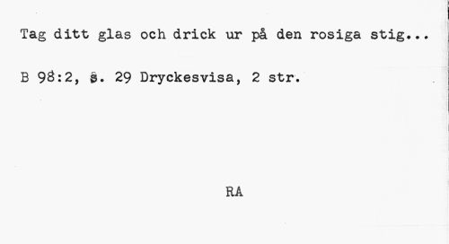 //// Tag ditt glas och drick ur på den rosiga stig... B 98:2, s. 29 Dryckesvisa, 2 str. //// i //// l //// RA ////