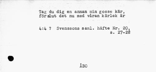 //// v //// Tag du dig en annan min gosse kär, //// förslut det nu med våran kärlek är //// - * •• . - • • • •• * * - — •• •• " ' \ //// ... & //// 4:4 ? Svenssons saml. häfte Nr. 20, //// s. 27-20 //// ÅBO ////