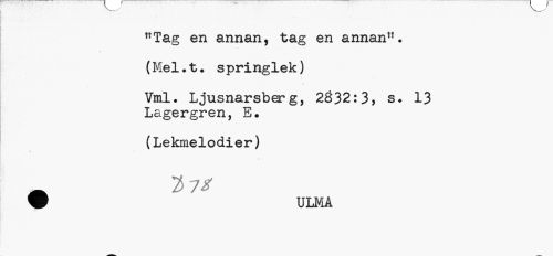 //// !tTag en annan, tag en annan11. (Mel.t. springlek) //// Vml. Ljusnarsberg, 2032:3, s. 13 //// Lagergren, E. (Lekmelodier) //// Ä 25 7* //// W ULMÅ ////