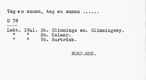 //// Tagen annan, tag en annan... //// D 78 //// Lekt. 1941. Sk. Glimminge sn. Glimmingeby. " " Sm. Kalmar. " " Vb. Burträsk. //// NORD.MUS. ////