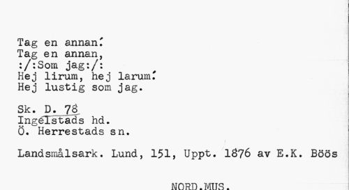 //// Tag en annanT Tag en annan, :/:Som jag:/: Hej lirum, hej larumT Hej lustig som jag. //// Sk. D. 78 Ingélstads hd. Ö. Herrestads sn. //// Landsmålsark. Lund, 151, Uppt. 1876 av E.K. Böös //// NORD.MUS. ////