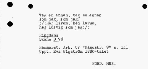 //// Tag en annan, tag en annan som jag, som jagf dfc :/:Hej lirum, hej larum, //// hej lustig som jag:/: //// Ringdans Skåne D ?Ö //// Hammarst. Ark. Ur "Manuskr. 9!t s. 141 Uppt. Eva Wigström lÖÖO-talet //// HORD. ivIUS. ////