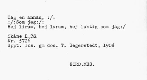 //// Tag en annan, :/: :/:Som jag:/: //// Hej lirum, hej lamm, hej lustig som jag:/ //// Skåne B 7& Nr. 5726 //// Uppt. Ins. gm doc. T. Segerstedt, 190$ //// -/ //// NORD.MUS. ////