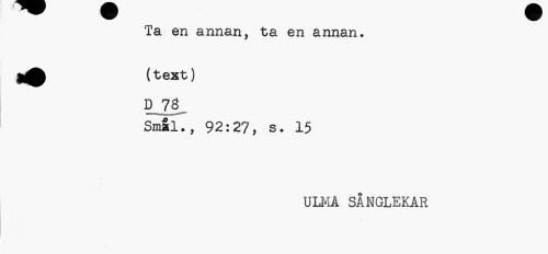 //// Ta en annan, ta en annan. //// I^A (text) //// D 78 //// Smål., 92:27, s. 15 //// ULMÅ SÅNGLEKAR ////