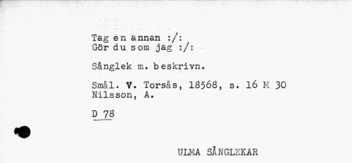 //// Tag é n annan :/: Gör du som jag :/: <• //// Sånglek m. beskrivn. //// v , //// Smål. V. Torsås, IÖ568, s. 16 M 30 //// Nilsson, A. D 78 //// ULMA SÅNGLEKAR ////