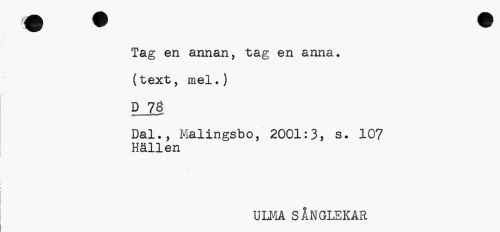 //// • • • //// Tag en annan, tag en anna. (text, mel.) //// p jå //// Dal., Malingsbo, 2001:3, s. 107 //// Hällen //// ULMÅ SÅNGLEKAR ////