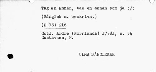 //// Tag en annan, tag en annan som ja :/: (Sånglek m. beskrivn.) (D 78) 216 //// Gotl. Ardre (Norrlanda) 17381, s. 54 //// Gustavson, H. //// a ULMÅ SÅNGLEKAR ////