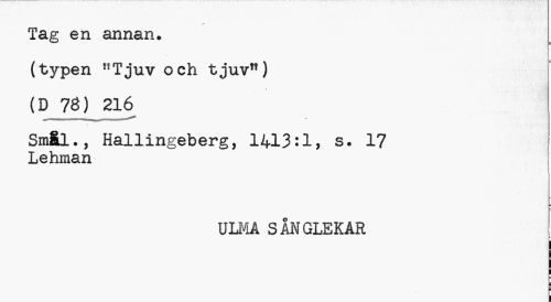 //// Tag en annan. //// (typen "Tjuv och tjuv") //// (D 78) 216 //// Sraål., Hallingeberg, 1413:1, s. 17 //// Lehman //// ULMA SÅNGLEKAR //// L f- //// I //// i //// I ////
