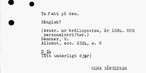 //// Tafatt på den. //// ^ Sånglek? //// (Avskr. ur bröllopsvisa, år 16Ö4. UUB personalskrifter.) Dencker, M. //// Allmänt, acc. 2324, s. 6 D 24 //// "(Ett underligt dj#r) //// a //// ULMA SÅNGLEKAR ////