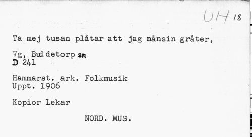 //// UH n //// Ta,mej tusan plåtar att jag nånsin gråter, //// Vg, Buldetorpsft D 241 //// 1 //// Hammarst. ark. Folkmusik //// Uppt. 1906 //// Kopior Lekar //// NORD. MUS. j ////