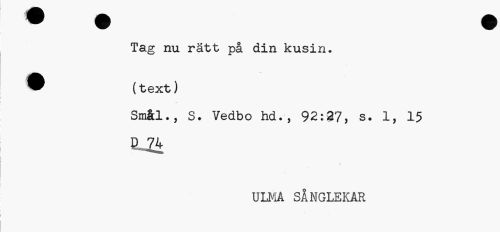 //// Tag nu rätt på din kusin. ® (text) //// Smål., S. Vedbo hd., 92:27, s. 1, 15 //// D 74 //// \ //// ULMA SÅNGLEKAR ////