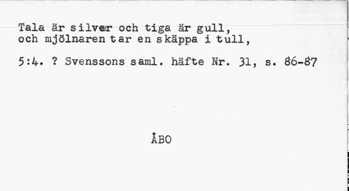 //// — Tala är silver och tiga ärg ull, " och mjölnaren tar en skäppa i tull, //// 5:4. ? Svenssons saml. häfte Nr. 31, s. 86-07 //// ÅBO ////