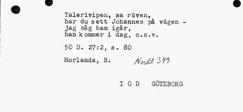 //// Talerivipen, sa räven, //// har du sett Johannes på vägen - //// jag såg ham igår, //// han k ornrner i dag, o.s.v. //// 50 D. 27:2, s. 00 //// Mor land a, B. fl/nJUW) //// I 0 D GÖTEBORG ////