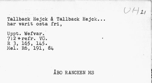 //// UHi, //// Tallback Hejck å Tallback Hejck. har varit osta fri, //// i //// Uppt. Wefvar. 7:2+refr. VÖ. //// R 3, 165, 145. //// Mel. R6, 191, 84 //// \ //// ÅBO RANCKEM MS j //// i i ////
